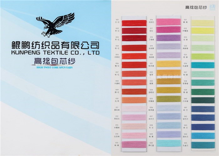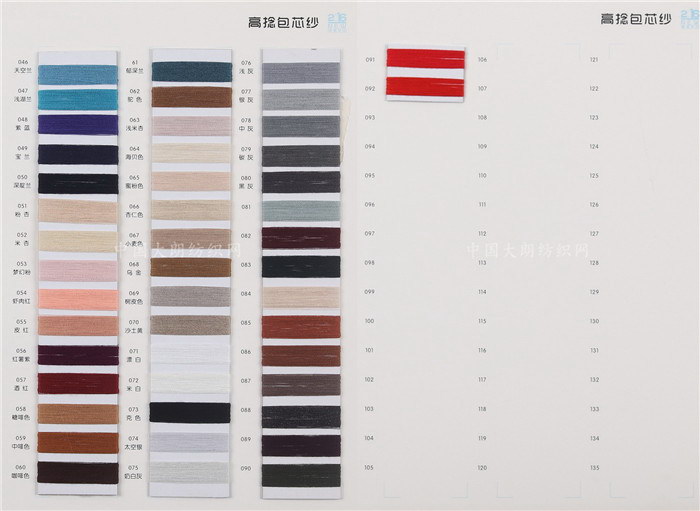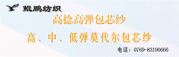 主营:有色(胚纱)竹节包芯纱、52S/2高捻高弹包芯纱、48S/2高弹兔绒包芯纱(胚纱)、48S/2高/中/低弹莫代尔包芯纱胚纱